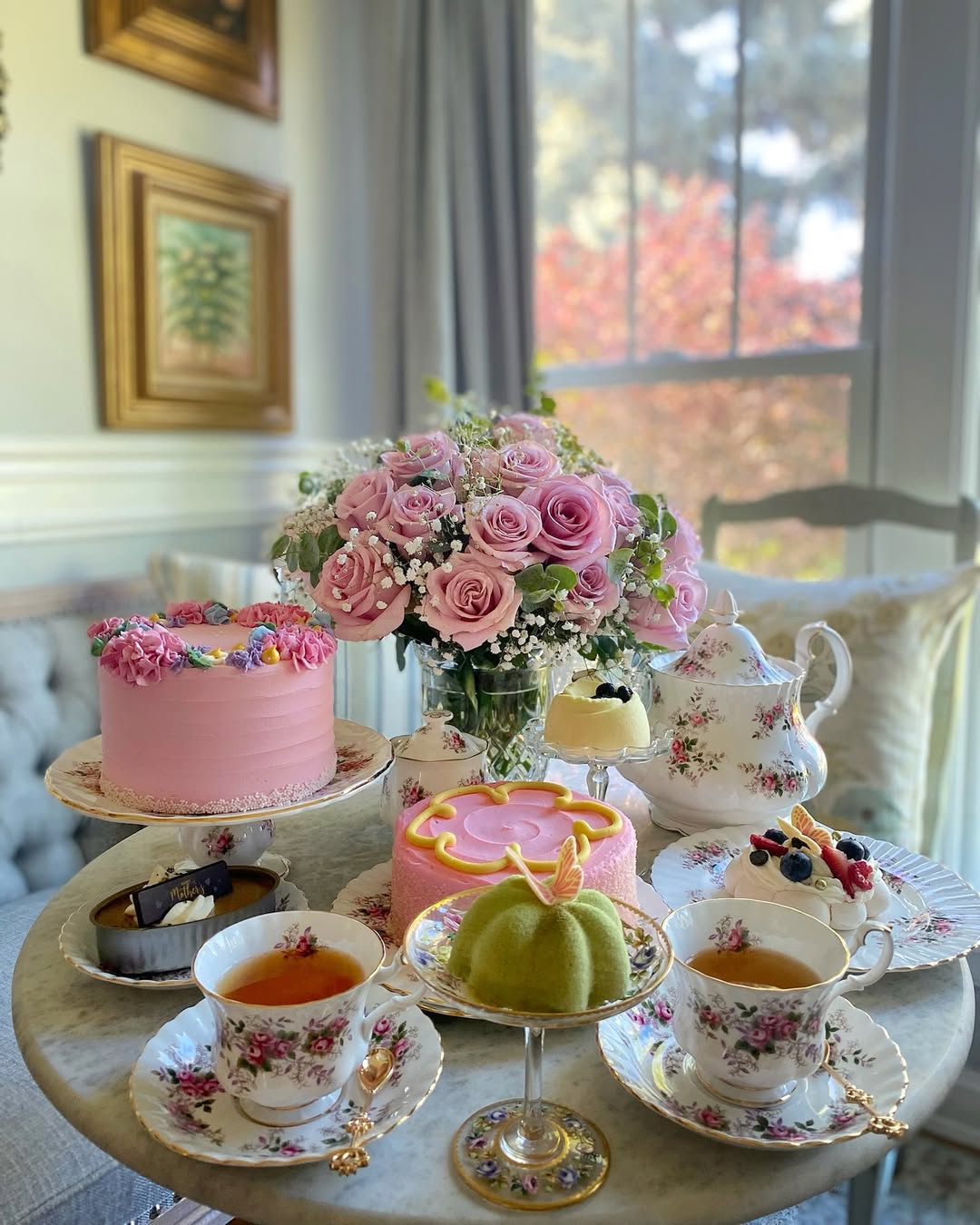 Start with the view and let everything else follow. A bouquet of blush roses anchors the table and quietly sets the palette. Floral china and soft pastel cakes echo that garden mood without feeling overstyled. It’s the kind of setup that makes tea feel like an occasion, not a routine.