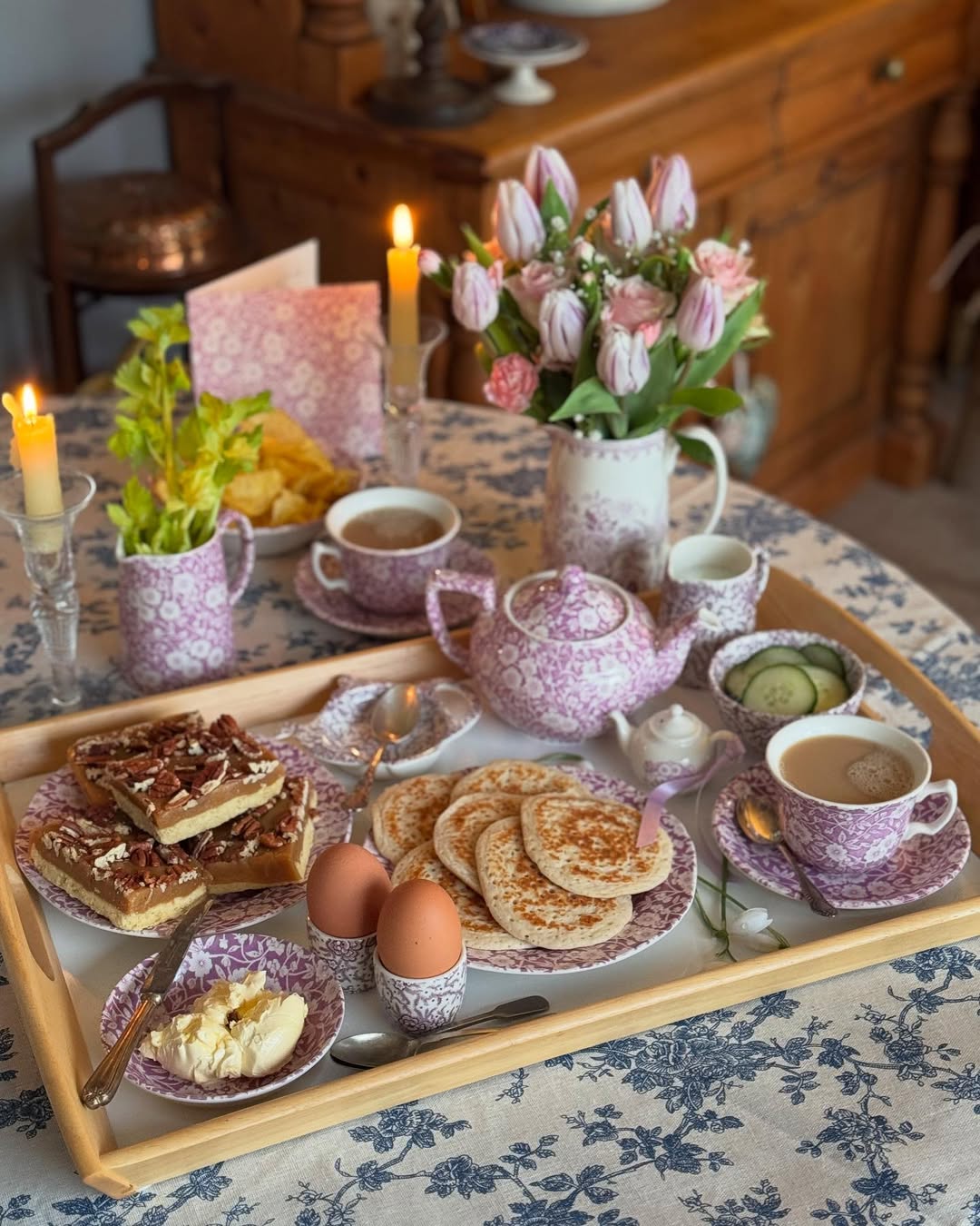 Bring the tea party to you—literally. A wooden tray corrals floral china, warm crumpets, and soft-boiled eggs into a perfectly contained spring setup. The lilac-patterned ceramics echo the tulips without feeling too matched. Candlelight adds just enough glow to make breakfast feel like a small ritual.
