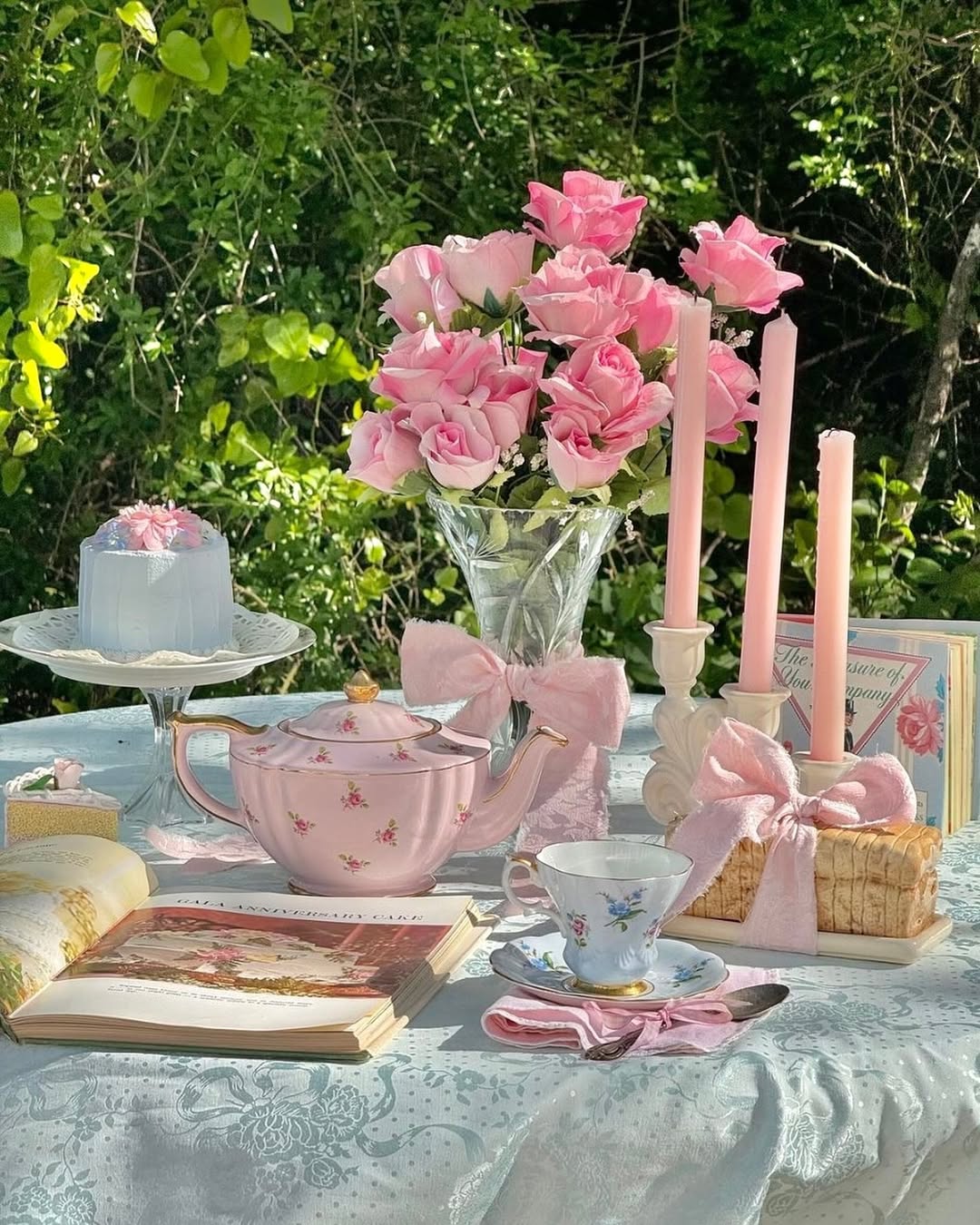 Feels like a page out of a vintage novel. A soft blue tablecloth sets a calm base for blush roses, pastel candles, and delicate china. The bows add a playful, almost gift-wrapped touch to everyday pieces. It’s equal parts garden party and quiet afternoon escape.
