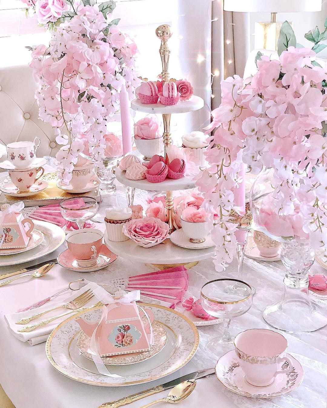 Go all in on florals and let them spill over. Cascading pink blossoms frame the table and instantly set a dreamy spring tone. The tiered stand keeps desserts elevated and visually balanced. Gold accents and soft blush layers make everything feel light, not overwhelming.