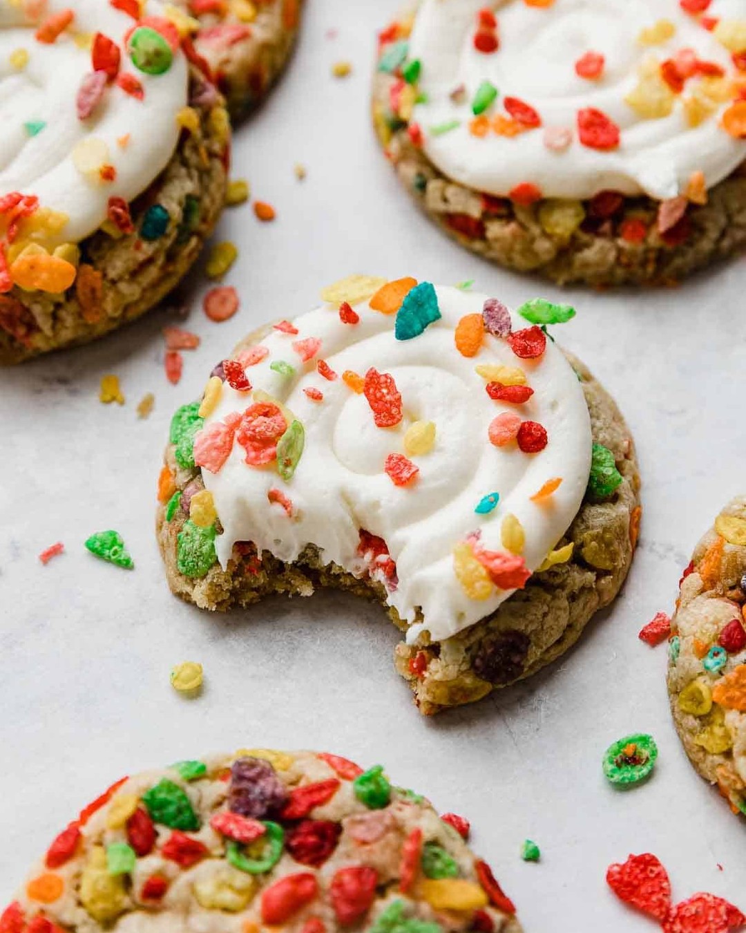 Color-packed cereal baked right into the dough gives these cookies instant personality. Rolling the edges in extra Fruity Pebbles doubles down on crunch and rainbow chaos. A thick swirl of marshmallow cream frosting softens the top like a cereal-milk cloud. They’re sweet, nostalgic, and unapologetically loud—in the best way.