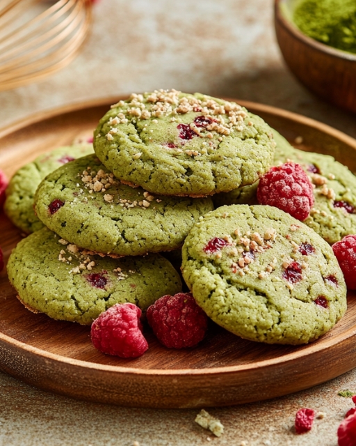 Earthy green matcha gives these cookies a calm, café-style vibe. Ruby bursts of raspberry cut through the dough for a bright, tangy contrast. The crinkled tops feel rustic in the best way. A sprinkle of berry crumbs and extra matcha turns each one into a bakery-worthy finish.