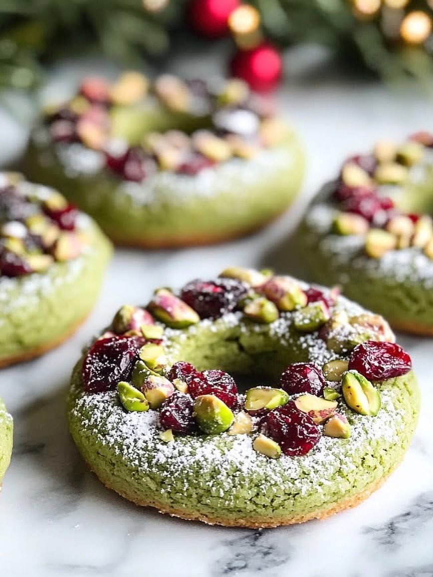 Soft pistachio dough bakes up in a delicate ring that feels instantly festive. A dusting of powdered sugar mimics fresh snow on the surface. Tart dried cranberries and chopped pistachios crown the top like jeweled ornaments. They’re elegant enough for a holiday platter but still cozy with an afternoon coffee.