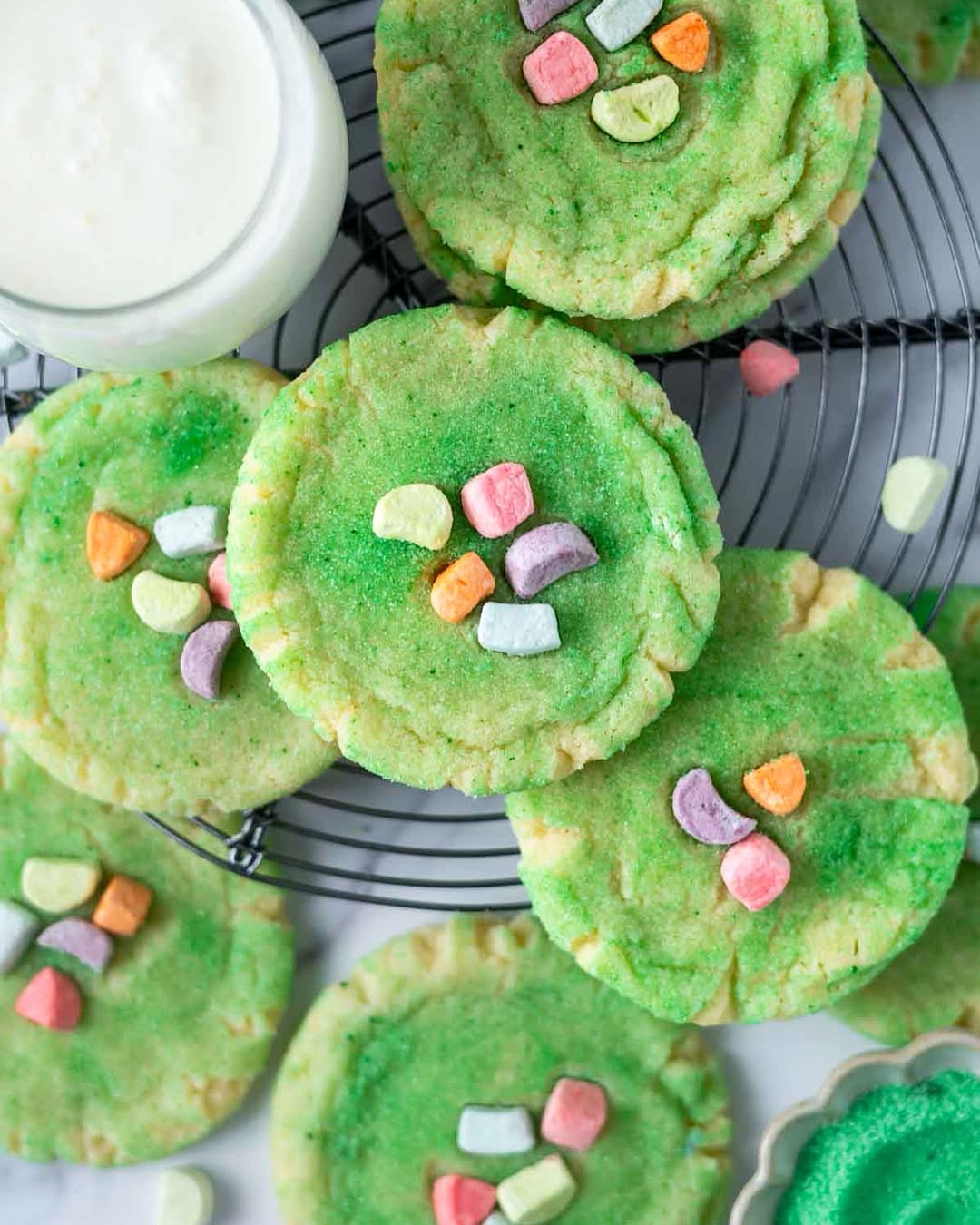 Bright green sugar gives these cookies their festive glow. The centers stay soft and thick thanks to a no-chill dough that bakes up pillowy. A scatter of pastel cereal marshmallows adds that throwback cereal charm. It’s basically your favorite drive-thru shake—reimagined in cookie form.