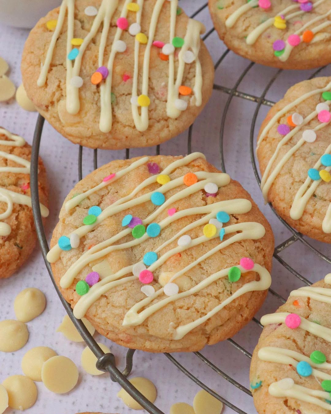 Rainbow sprinkles folded into the dough give these cookies instant party energy. White chocolate chips melt into creamy pockets throughout. A drizzle of white chocolate across the top adds a bakery-style finish. They’re soft in the center, lightly crisp at the edges, and basically a celebration in cookie form.