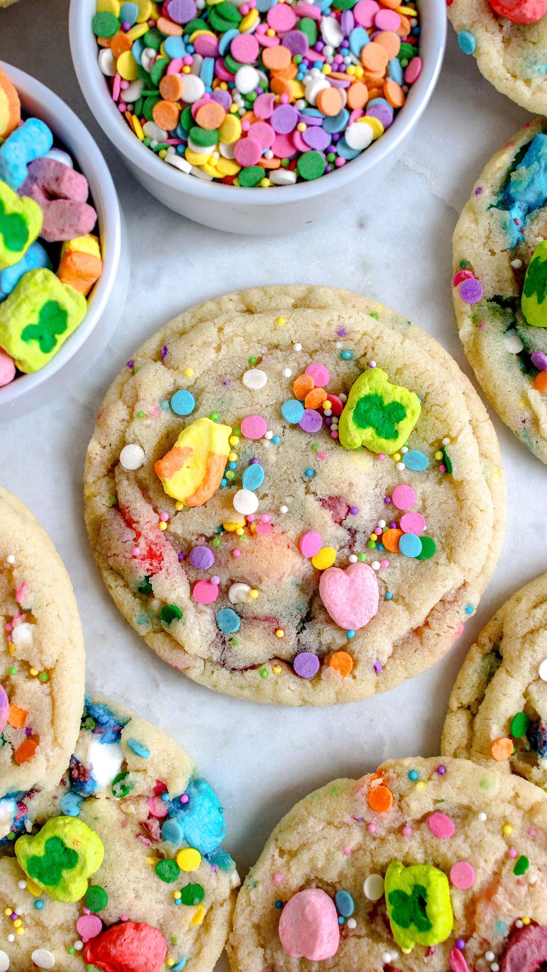 Chewy centers and crisp golden edges give these sugar cookies the perfect bite contrast. Pops of pastel marshmallows bake right into the tops for that unmistakable cereal charm. Rainbow sprinkles scatter across the surface like edible confetti. They’re sweet, nostalgic, and practically begging for a glass of milk.