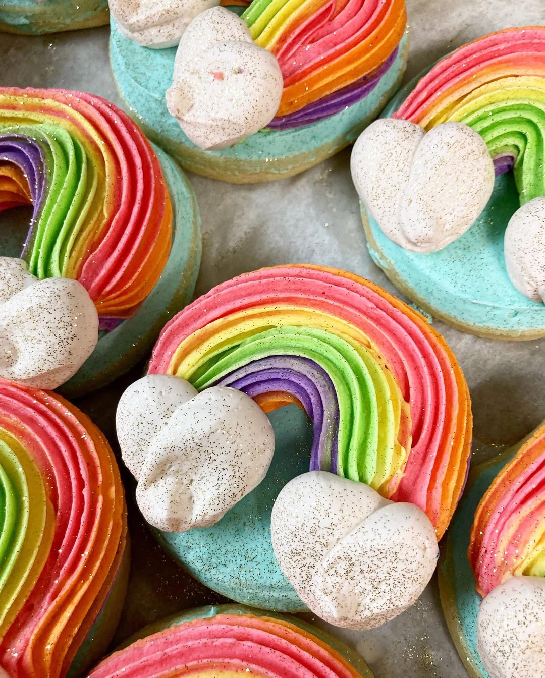Piped bands of buttercream create a full technicolor arc across each cookie. The smooth blue icing base gives the rainbow room to pop. Fluffy marshmallow clouds anchor the ends like a storybook scene. A dusting of edible glitter adds just enough sparkle to make them party-ready.