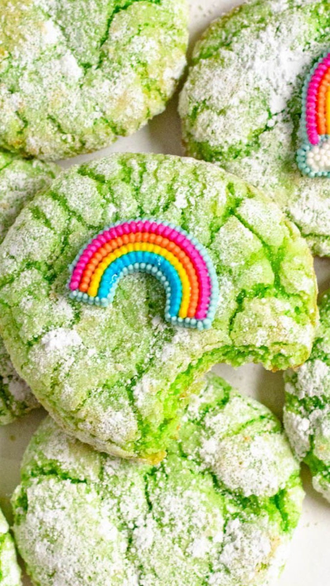 Bright green dough bakes into dramatic crackled tops that feel straight from a holiday bakery case. A heavy roll in powdered sugar settles into every crevice for that classic snowy finish. The soft centers stay tender beneath the delicate crust. A tiny rainbow topper turns each one into a bite-sized good luck charm.