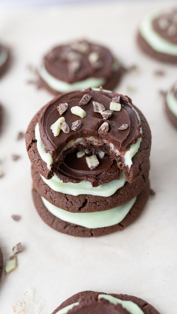 Rich cocoa cookies stack up like a bakery showpiece. A thick layer of pale mint filling peeks out between the layers for that classic Andes contrast. Glossy chocolate ganache spreads across the top in a swoop. A sprinkle of chopped mint pieces adds crunch and just enough drama.