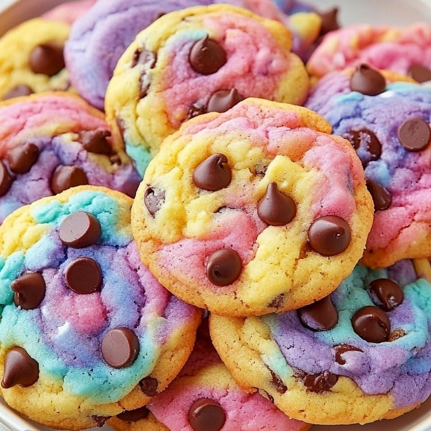 Soft pink, lavender, yellow, and blue dough twist together for a full-on cotton candy effect. The marbled finish makes every cookie feel one of a kind. Melty chocolate chips dot the surface for that classic comfort hit. They’re playful, nostalgic, and impossible to ignore on a dessert table.