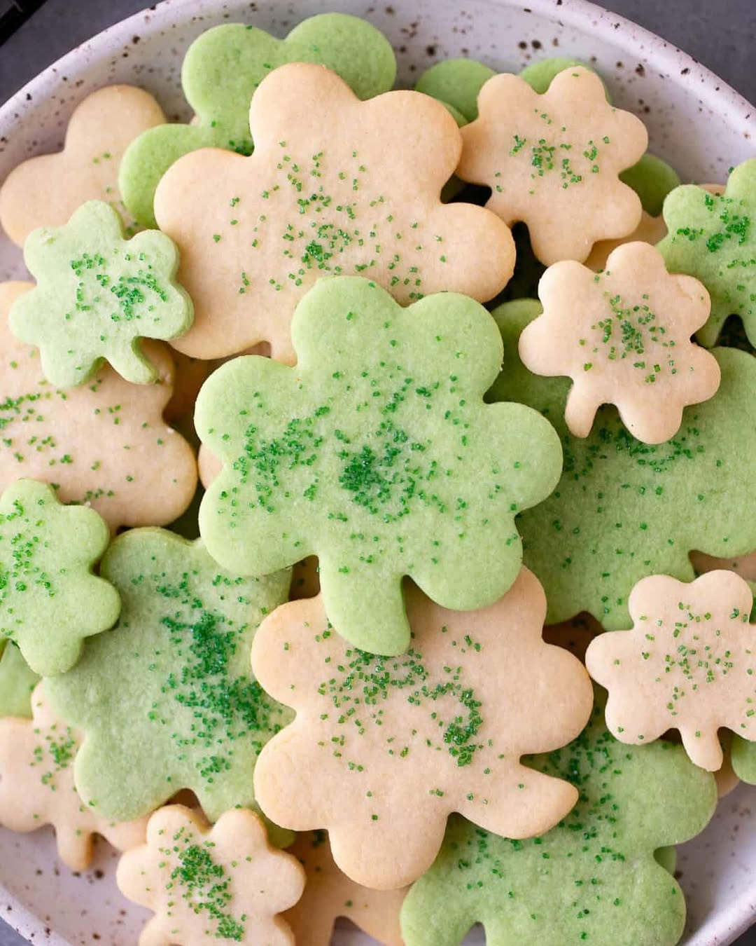 Soft green and classic vanilla cookies layer together like a sweet little clover patch. The scalloped edges from the cutters keep the shapes playful instead of fussy. A pinch of green sanding sugar in the center adds just enough sparkle. They’re simple, nostalgic, and exactly what you want next to a tall glass of milk.