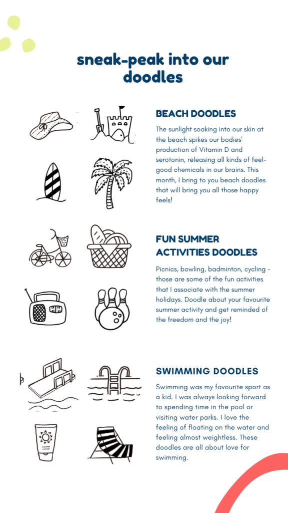 Doodling is mainly to use the extra space in your bullet journal and fill it up with fun creativity. These summer bullet journal doodles are perfect for your summer BuJo pages. Whether it is something easy, fruity, or spring-like, you will find it all in this curated list of doodle ideas.