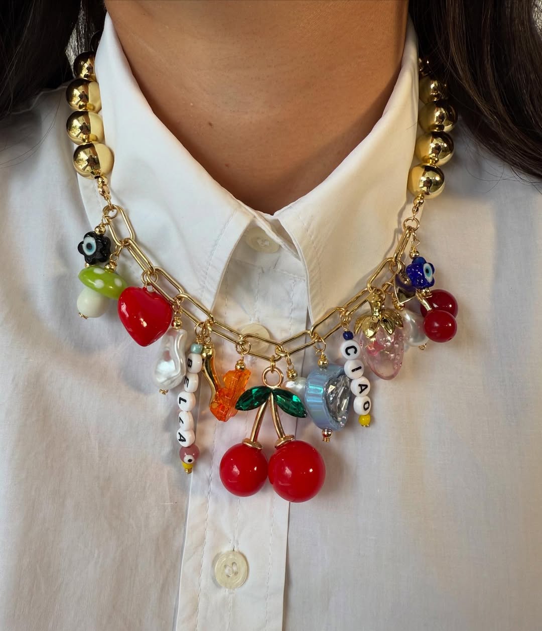 A DIY necklace like this turns jewelry into a personal narrative. Chunky gold links carry playful charms—glass cherries, hearts, beads, even name letters—that make each piece feel one-of-a-kind. The mix of textures and colors hits that nostalgic, Y2K-inspired sweet spot. Great for Valentine’s gifting, but even better as a customizable product line.