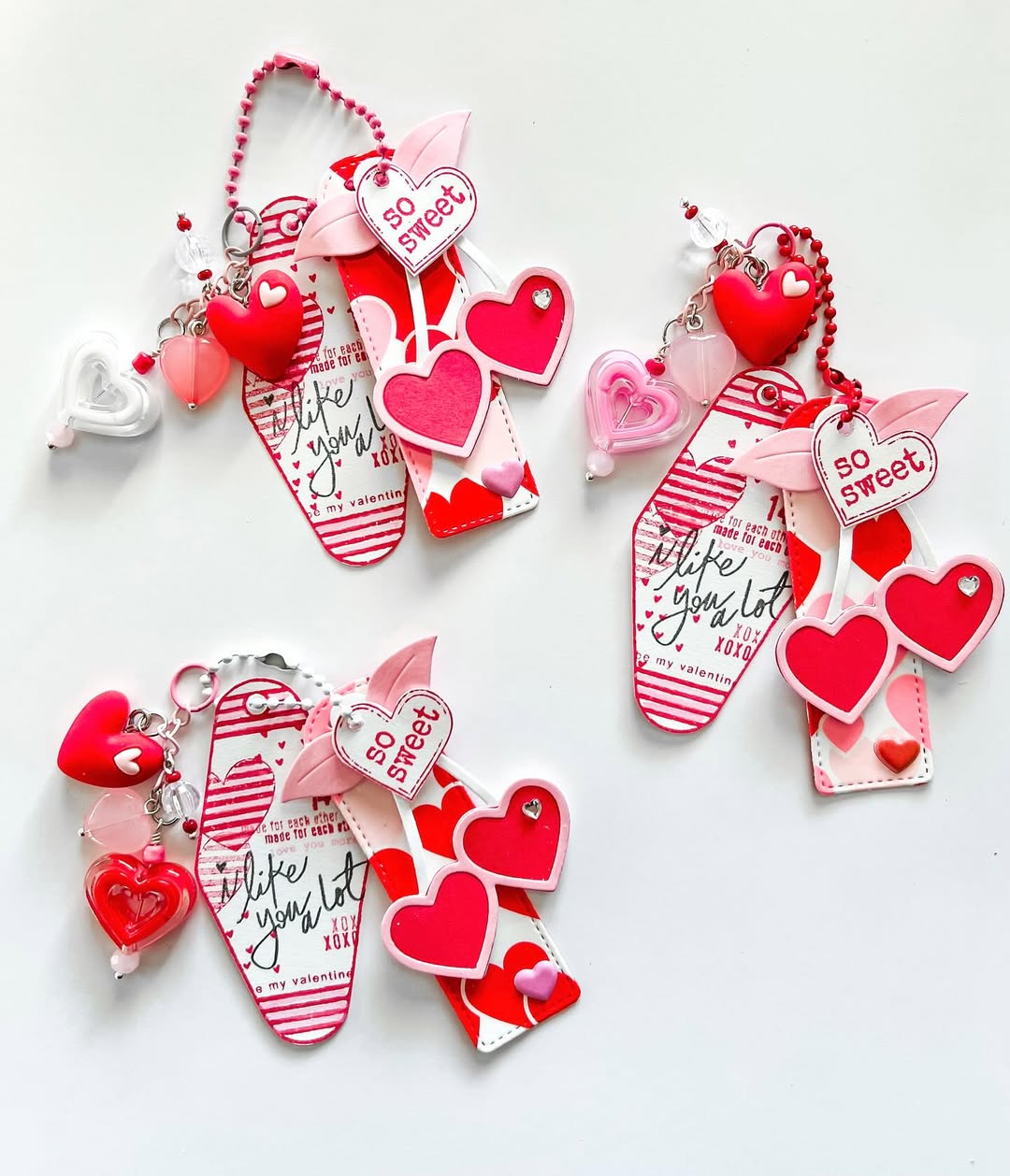 These Valentine tags mix retro charm with dangly fun—like a love note and accessory in one. Layered cardstock, bold lettering, and cherry-heart shapes give off scrapbook-meets-candy-shop vibes. Add acrylic heart charms and mini beads, and they’re suddenly gift toppers, bag tags, or even mini keepsakes. A perfect product for crafters who love to mix paper and sparkle.