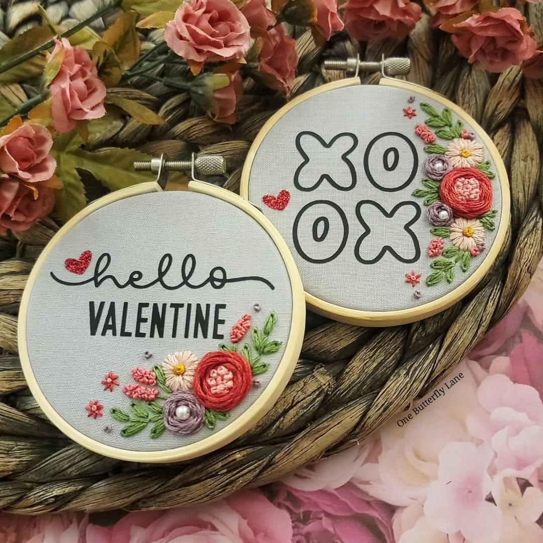 Embroidery hoops with Valentine quotes are part décor, part keepsake. Bold lettering like “hello Valentine” or “XOXO” gets softened with hand-stitched florals and tiny hearts. The mix of typography and texture makes them modern yet handmade. These sell beautifully as wall art, gift toppers, or even personalized orders with names and dates.