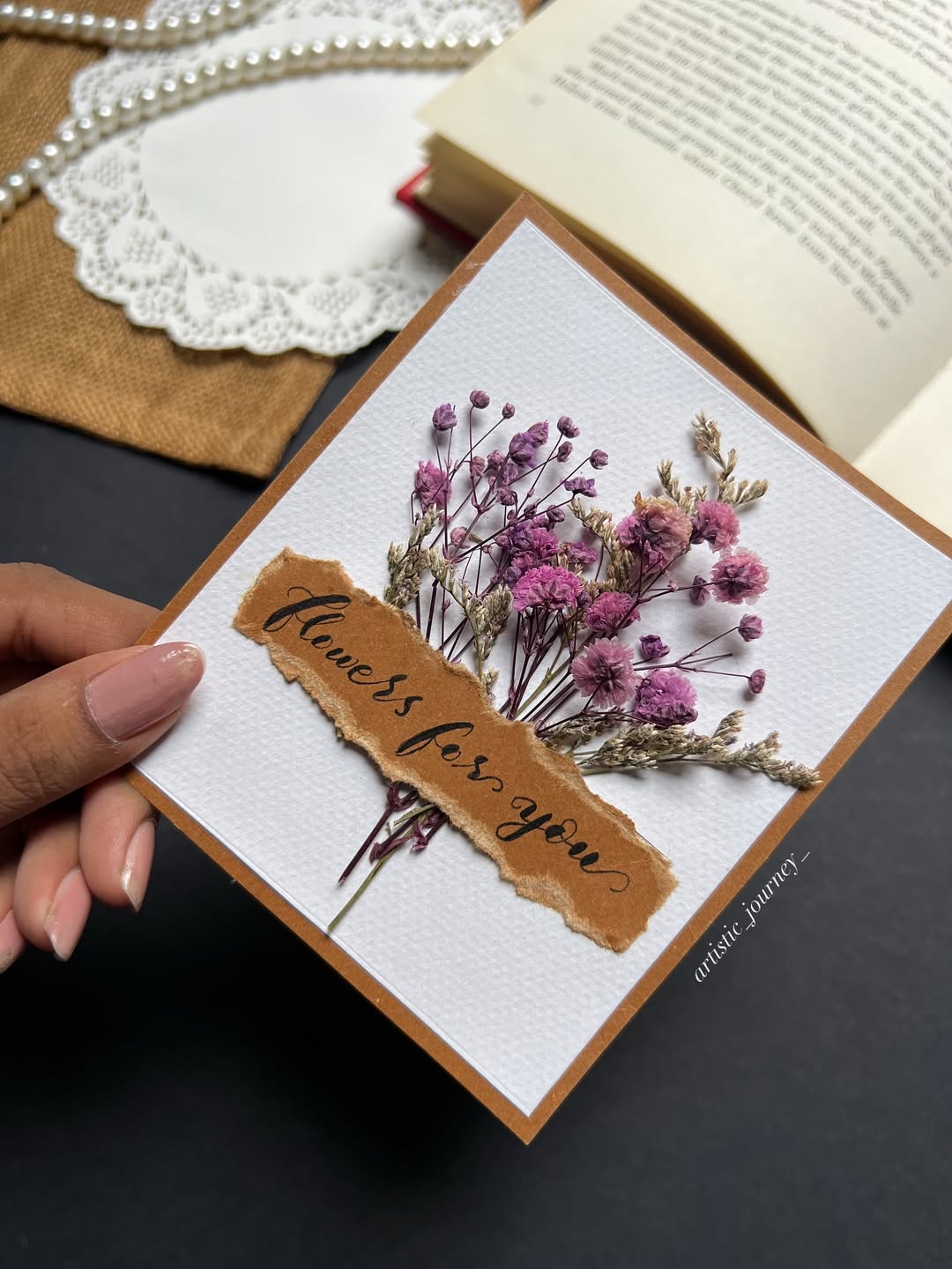Pressed flower cards are the slow art we didn’t know we needed—and they sell like charmers. This design keeps costs low and impact high: textured paper, torn kraft labels, and a sprig of dried blooms. Each card feels artisanal without being fussy, which makes it gift-ready and market-stall perfect. Pro tip: bundle them in sets for weddings, anniversaries, or Galentine’s pop-ups.