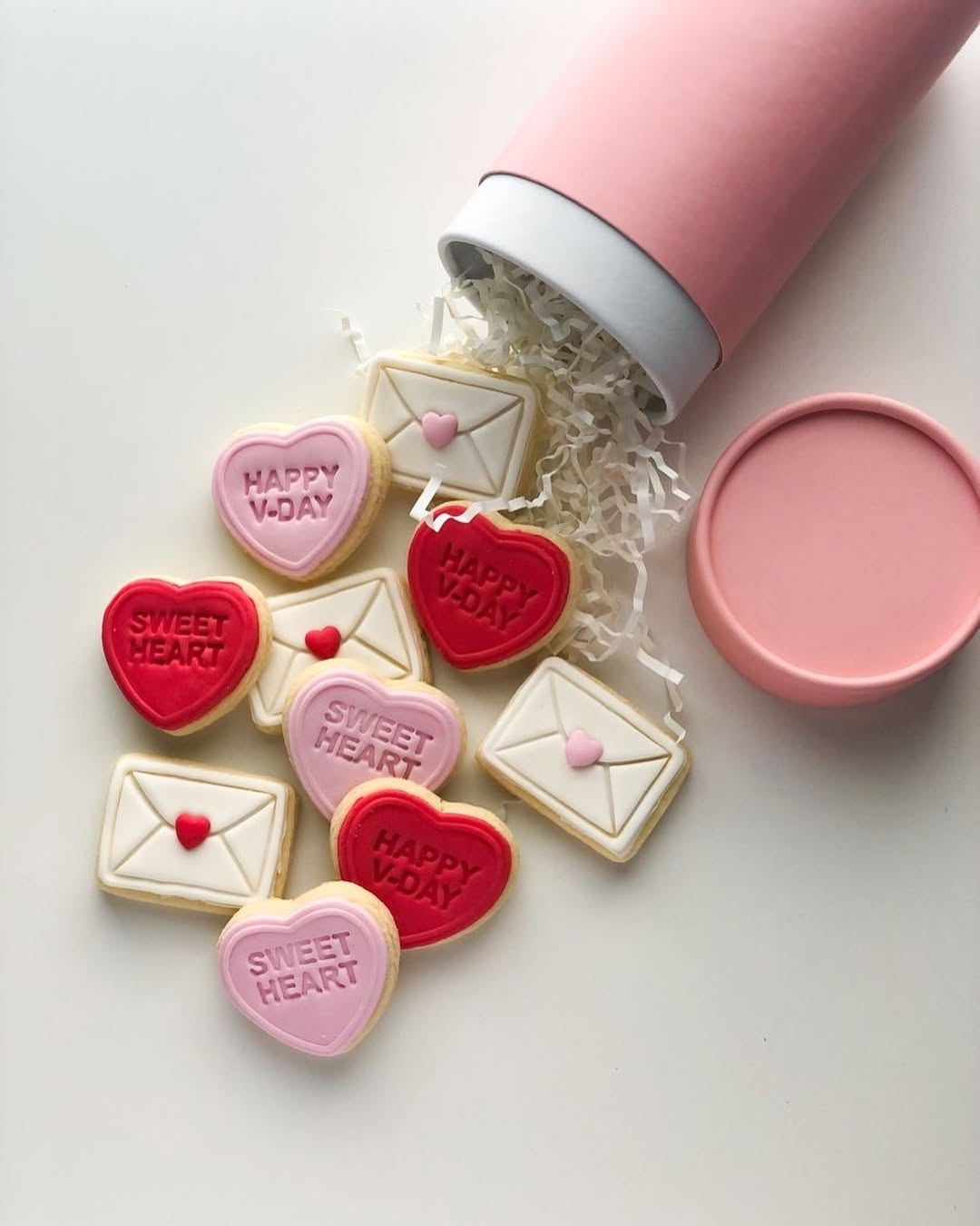 Mini Valentine cookies are tiny treats with major charm. Hearts stamped with “Sweetheart” and “Happy V-Day” pair perfectly with envelope designs, making them feel like edible love notes. The pastel pinks and bold reds pop against buttery cookie bases, keeping them festive and gift-ready. Packaged in chic tubes or boxes, they’re ideal for party favors, gift sets, or bakery upsells.