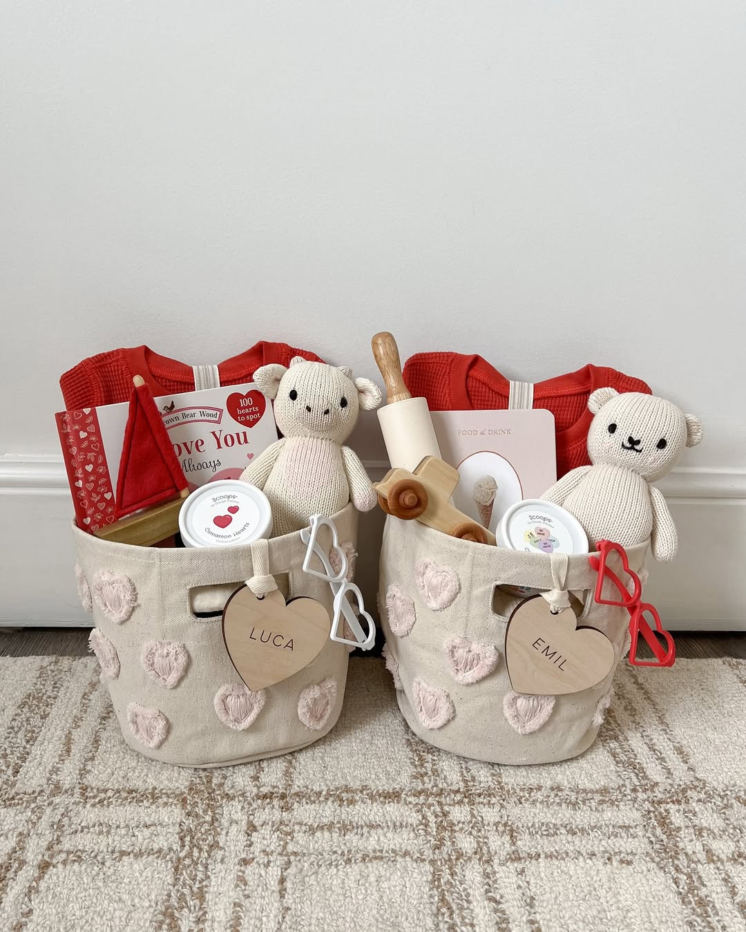 Love Day baskets are basically Valentine’s gift boxes—but with a toddler-friendly twist. Think soft toys, mini books, heart glasses, and name tags that make it personal. The textured bins and soft-pink palettes feel cozy, not commercial. They’re perfect for custom orders and can be easily themed by age, color, or vibe (hello, sibling sets!).