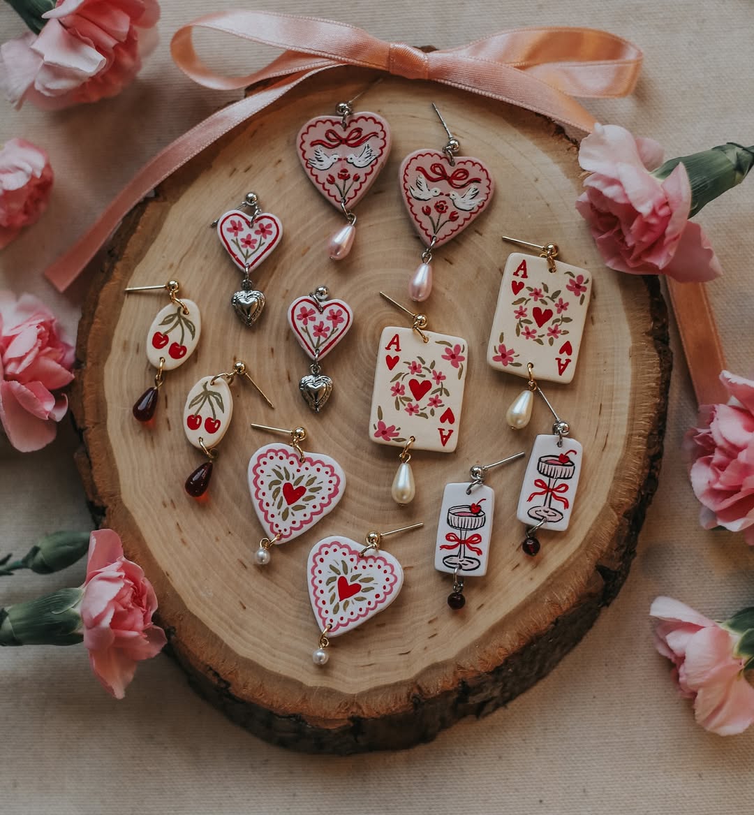These Valentine-themed clay earrings are wearable art with a wink. Think hearts, cherries, lovebirds, and even Ace of Hearts—each pair packed with playful detail and a dash of retro flair. Lightweight polymer clay keeps them comfy, while pearls and charms elevate the look. Perfect for Etsy shops or pop-up stalls where personality sells.