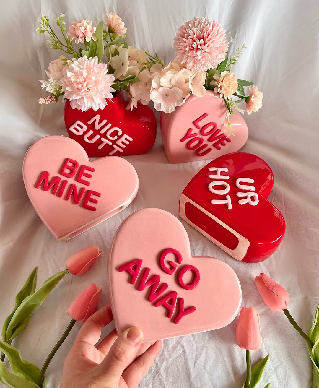 Bold, glossy, and just cheeky enough, these Valentine vases turn classic conversation hearts into functional décor. The 3D lettering pops against pink and red ceramic, making each one a playful statement piece. Fill them with blooms for a romantic vibe or sell them as standalone accents. A fun craft that doubles as a quirky gift-shop bestseller.