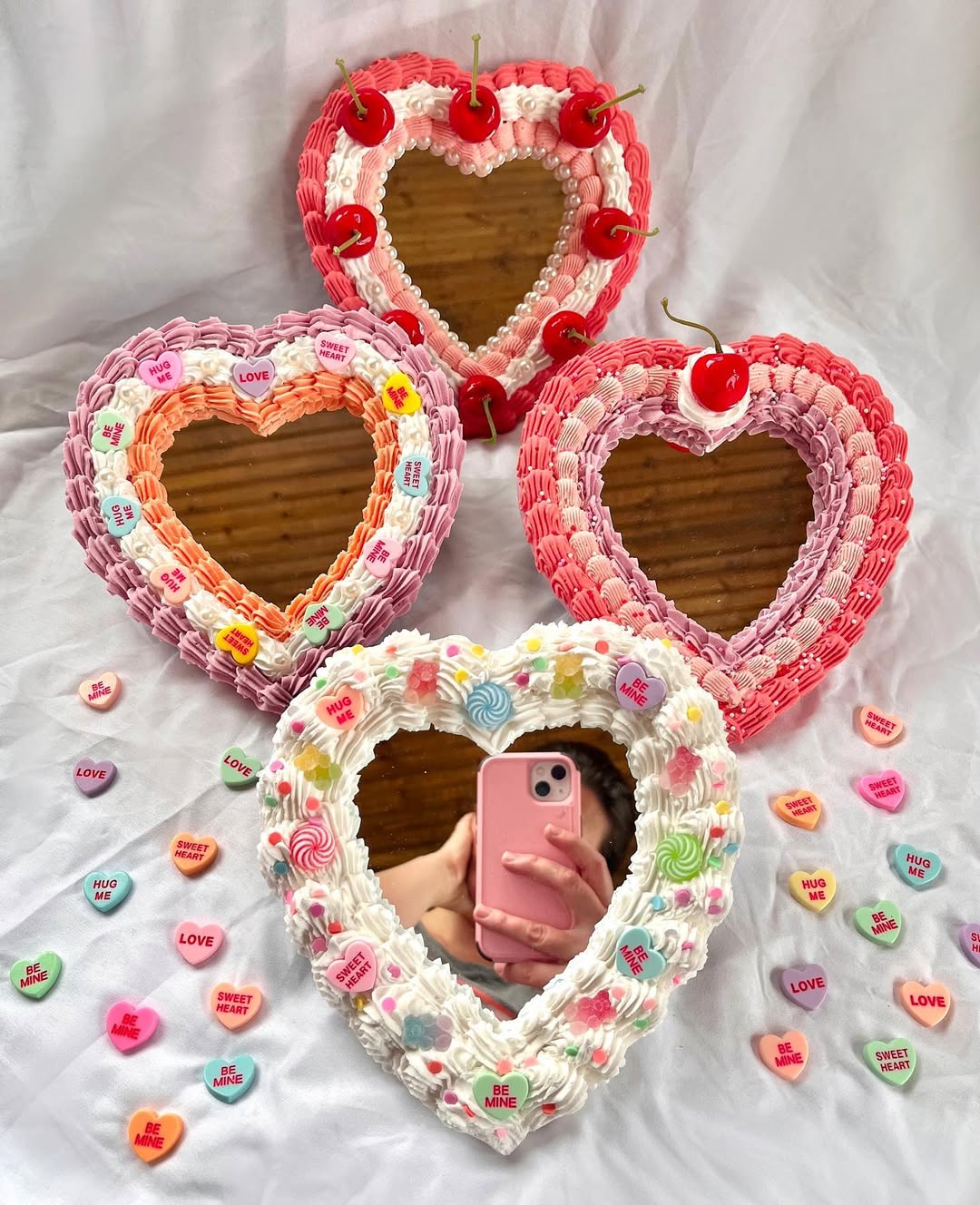 Heart-shaped mirrors get a candy-coated upgrade with piped “frosting” frames, faux cherries, and pastel conversation hearts. The playful detailing makes them look edible, but their true purpose is wall candy. They’re the kind of whimsical décor that sells big on social platforms. To stand out, offer custom colors or messages for a truly personalized piece.