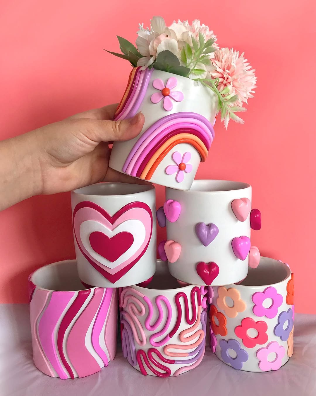 These DIY planters are what happens when polymer clay meets Valentine’s Day and throws a party. Think bold hearts, rainbows, retro florals, and 3D textures that pop right off the pot. The best part? Basic ceramic mugs become mini canvases for max creativity. Perfect for desk plants, gift sets, or even custom name orders.