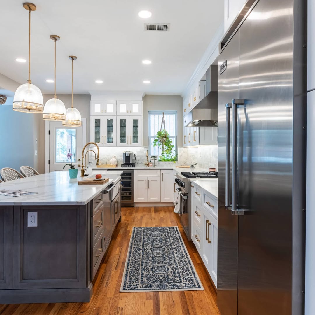 Faint gray veining in the quartz countertop mirrors the island’s smoky base tone, tying the whole space together without trying too hard. A trio of globe pendants ups the glam, casting a soft glow over the prep zone. Brass hardware and pro-level appliances mean business, while the vintage runner adds just enough cozy. Gourmet, but grounded.
