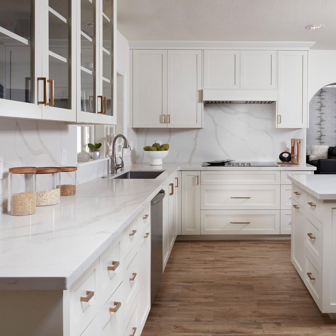 Long, fluid veining climbs from the countertops straight up the backsplash, creating one seamless visual flow. Framed shaker cabinets keep things classic, while brass pulls bring a modern edge. Pale wood-look floors ground the all-white palette and add just enough rustic charm. Calm, clean, and quietly confident.