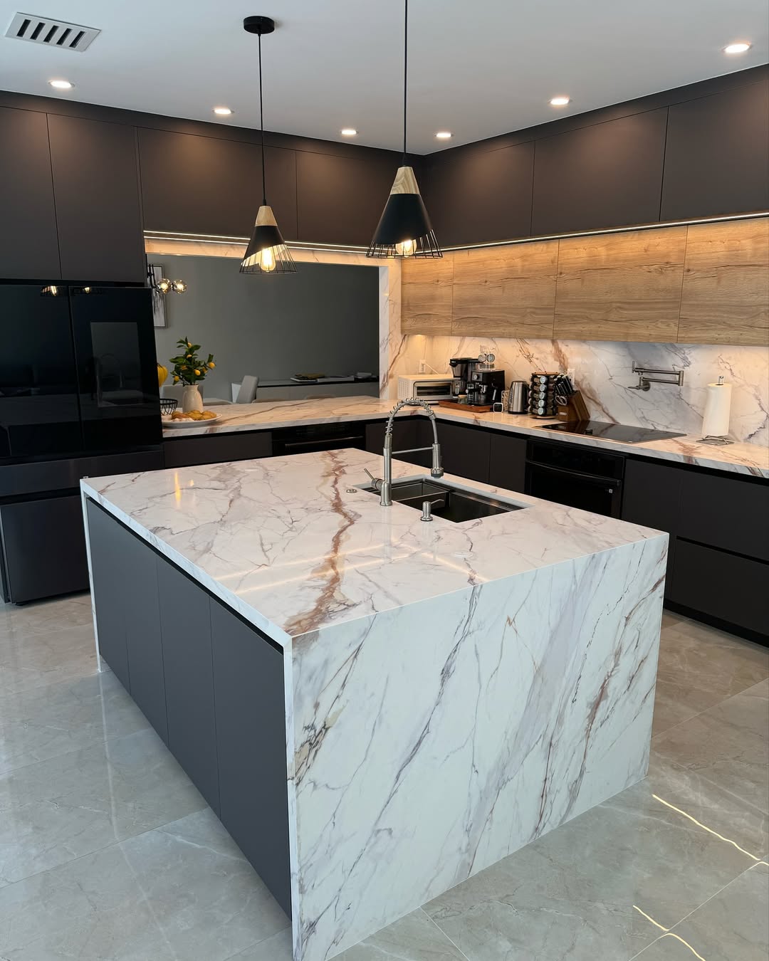 Veining here doesn’t whisper—it commands the room. The quartz waterfall island and matching backsplash add bold movement against sleek matte black cabinetry. Under-cabinet lighting and wood accents warm up the high-contrast palette. Luxe but livable, it’s a kitchen built for both espresso shots and statement shots.