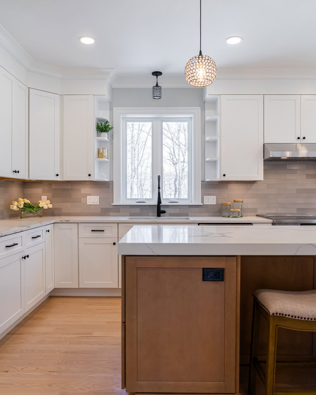 Veining stays subtle, letting the quartz surface act like a calm canvas amid layered neutrals. A warm wood island adds contrast without overpowering, and the built-in outlet is a practical bonus cleverly tucked into the paneling. Matte black fixtures and sandy backsplash tile help bridge the modern-traditional gap. Everything lands in that just-right middle ground.