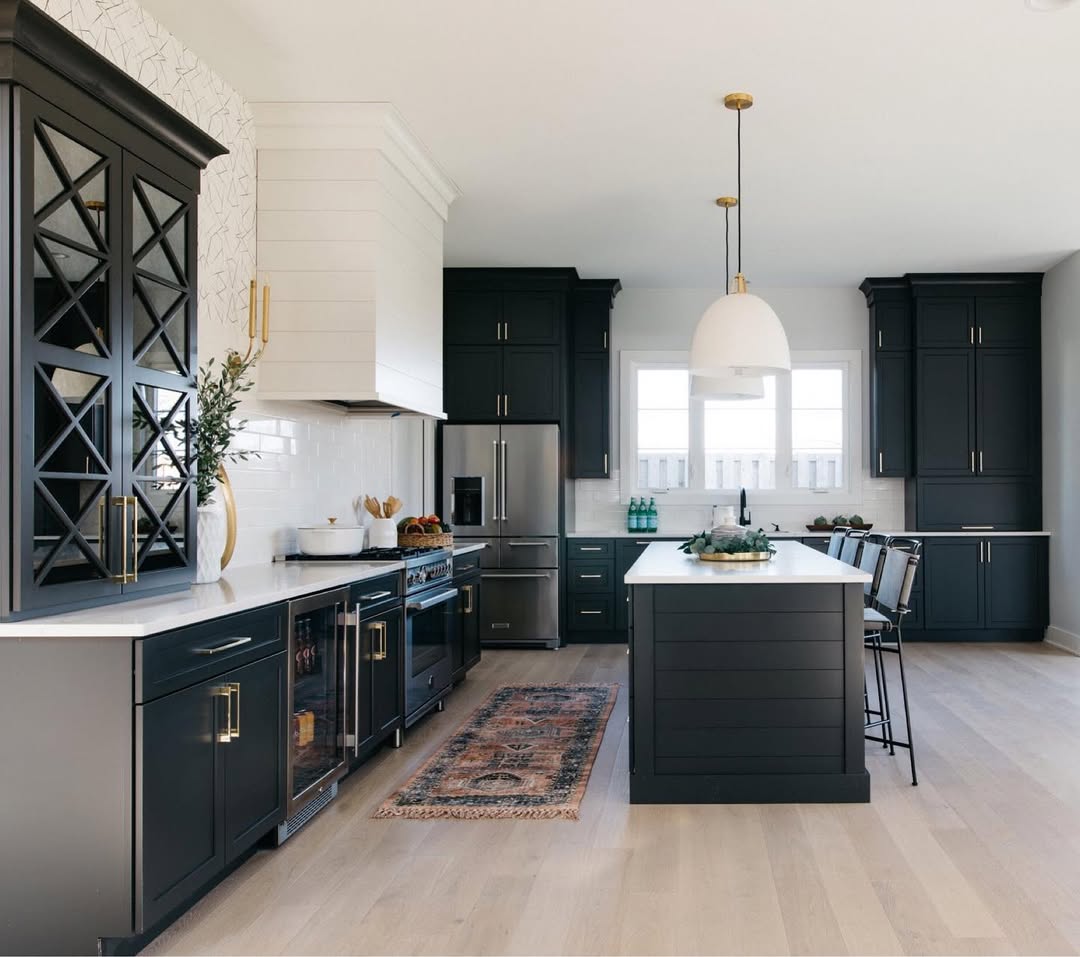 Crisp quartz counters bring balance to all the bold, inky cabinetry. The surfaces stay clean and cool while the deep green-black finish and brass hardware bring the mood. A vintage runner softens the palette and adds just enough warmth underfoot. It’s modern farmhouse—but make it moody.