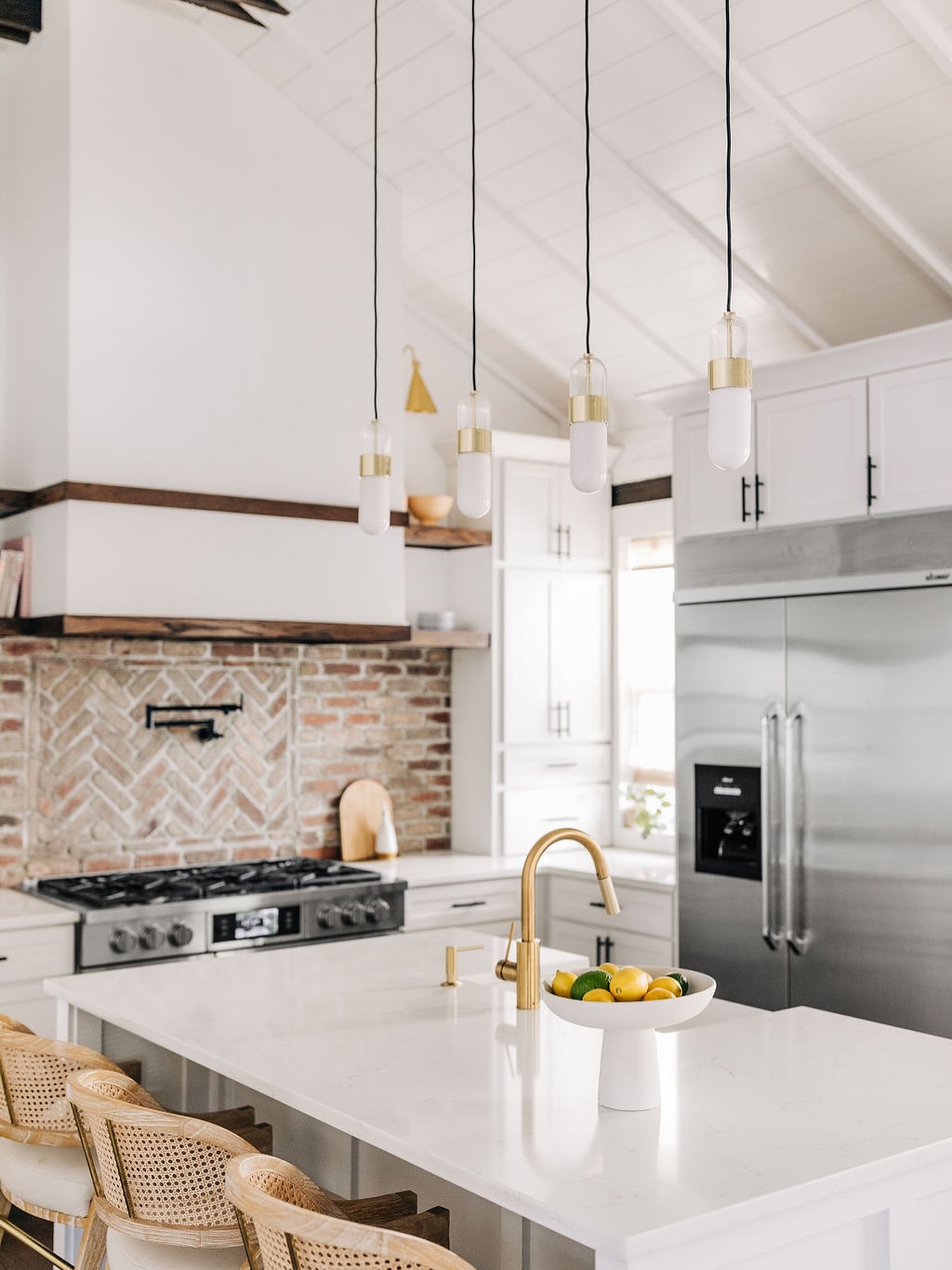Smooth quartz counters strike a clean contrast against the rustic brick backsplash and warm wood accents. Vaulted ceilings and elongated pendants draw the eye up, while cane-back stools bring the charm back down to earth. A brushed brass faucet adds polish without losing the farmhouse ease. Fresh, layered, and lemon-slice ready.