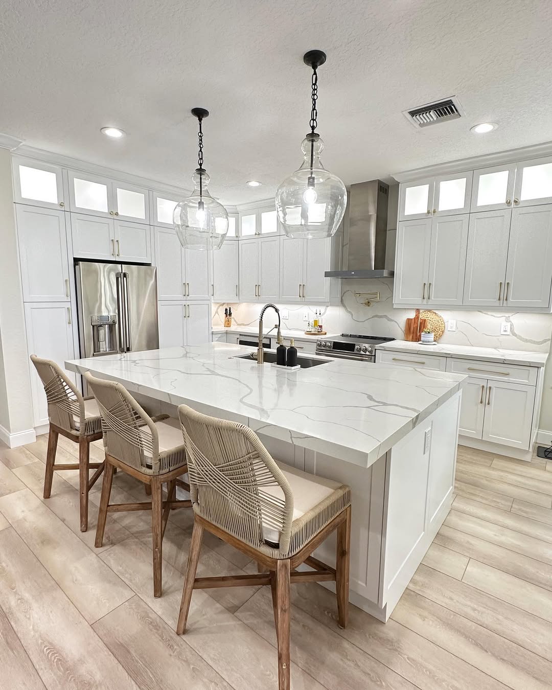 Graceful veining flows across the quartz countertops like an abstract map, adding quiet movement to the all-white palette. Glass globe pendants bring in breezy elegance without blocking the view. Rope-wrapped counter stools keep the texture game strong while echoing the warm tones of the floor. Light, layered, and ready for coastal calm.