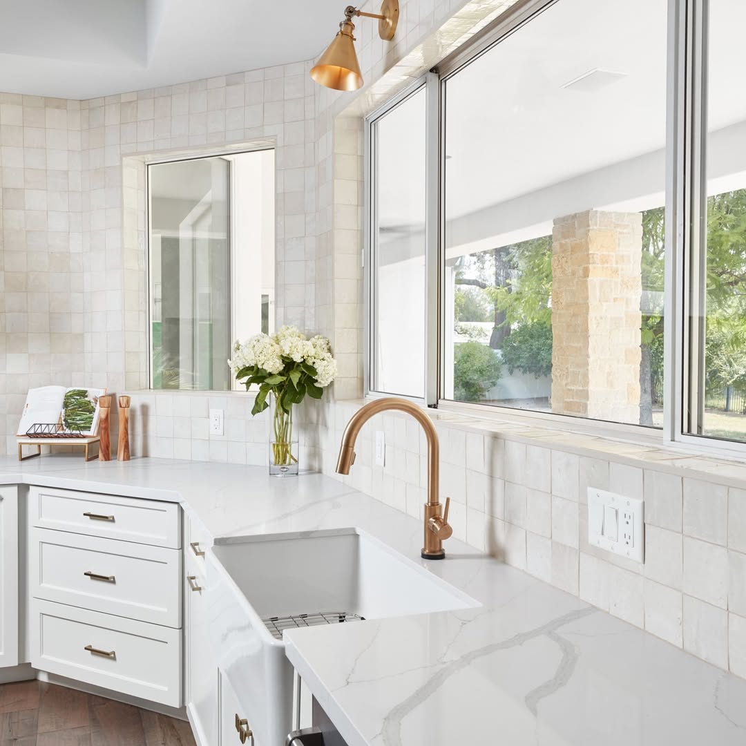 Feathered veining adds a soft rhythm across the quartz surface, anchoring the space without overwhelming the textured zellige tile walls. The copper-toned faucet brings warmth and contrast, playing beautifully off the creamy palette. Floods of natural light make every material pop. Earthy, elegant, and totally easy on the eyes.