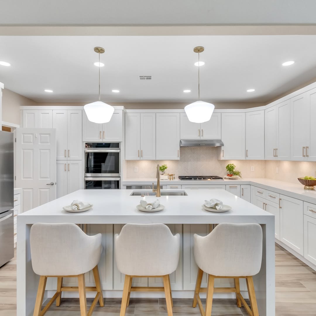 A thick-edge quartz island makes a strong, simple statement in this clean-lined kitchen. Vertical paneling adds just enough texture to keep the all-white palette from falling flat. Upholstered stools and soft pendant lights lean into the cozy, not clinical. Everything’s calm, collected, and ready for takeout—or a Tuesday night feast.