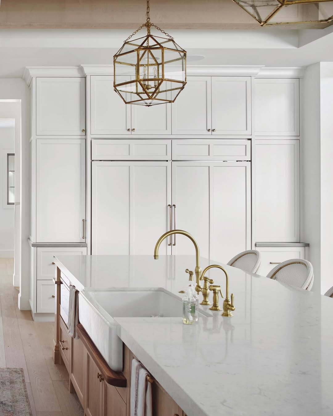 Faint speckles in the quartz surface add just enough detail to play off the rich brass fixtures and wood island base. Panel-front cabinetry hides the appliances for a seamless, ultra-tailored backdrop. That geometric lantern pendant steals a glance without stealing the show. Traditional bones, dressed in quiet luxury.