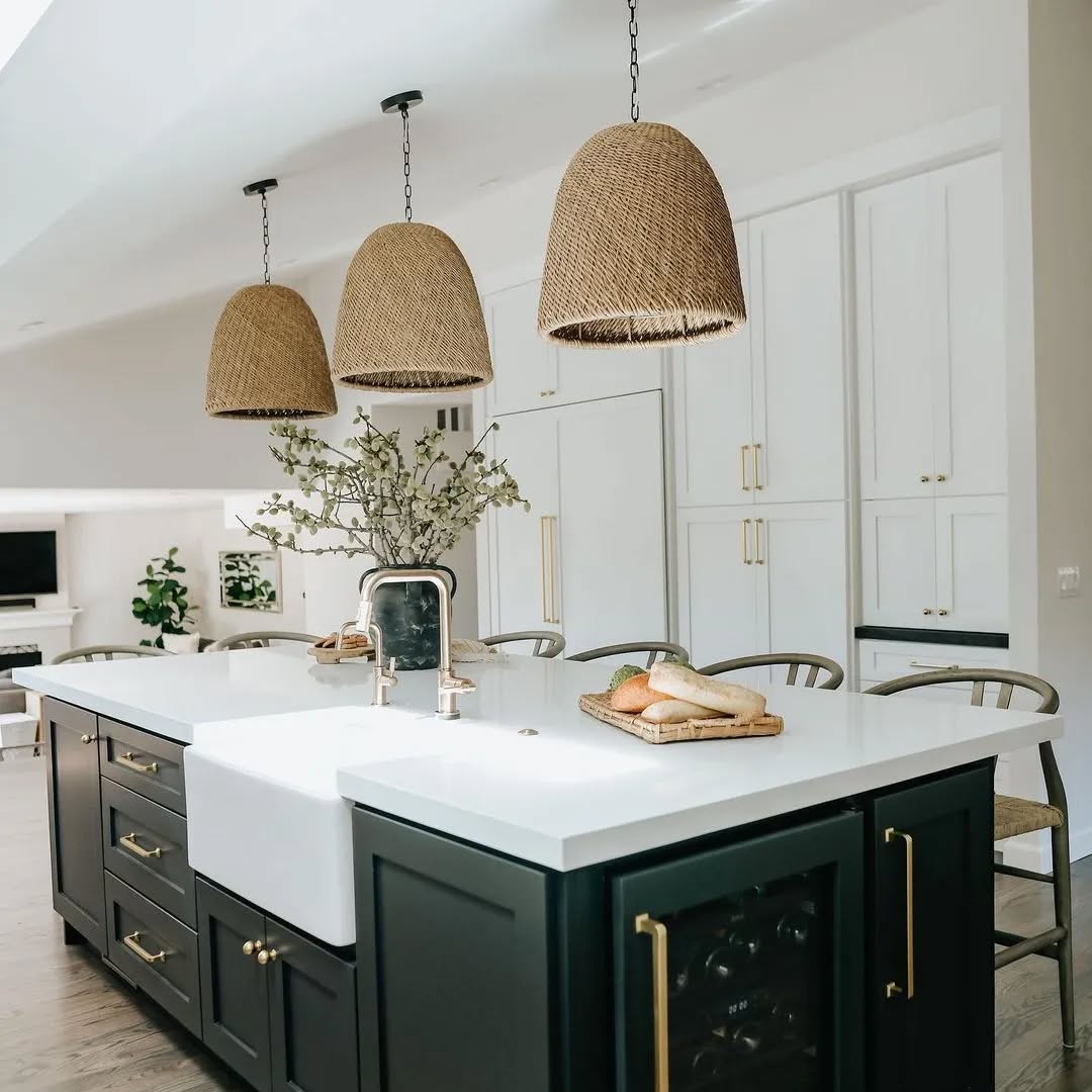 This kitchen lets the white quartz countertop shine—literally. Its crisp, clean surface brightens up the black island base and bounces light from those oversized woven pendants. The contrast feels polished but not precious, thanks to organic textures and soft gold hardware. Skip the clutter; the quartz does all the heavy lifting.