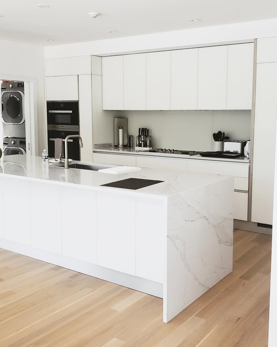 Veining spills down the waterfall edge like it was poured in place—clean, crisp, and intentional. Handle-free cabinets and an all-white palette keep everything feeling gallery-level sleek. Natural wood floors warm it up just enough to sidestep sterile. Modernism, minus the cold shoulder.