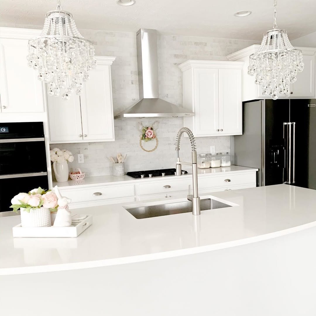 Glossy quartz counters curve gently into a soft, sculptural island—no edges, no fuss, just shine. Crystal chandeliers steal the show overhead, turning this all-white kitchen into a glam little dream. Even the faucet feels fancy next to the florals and bunny tray. Sweet, sparkly, and sprinkled with charm.