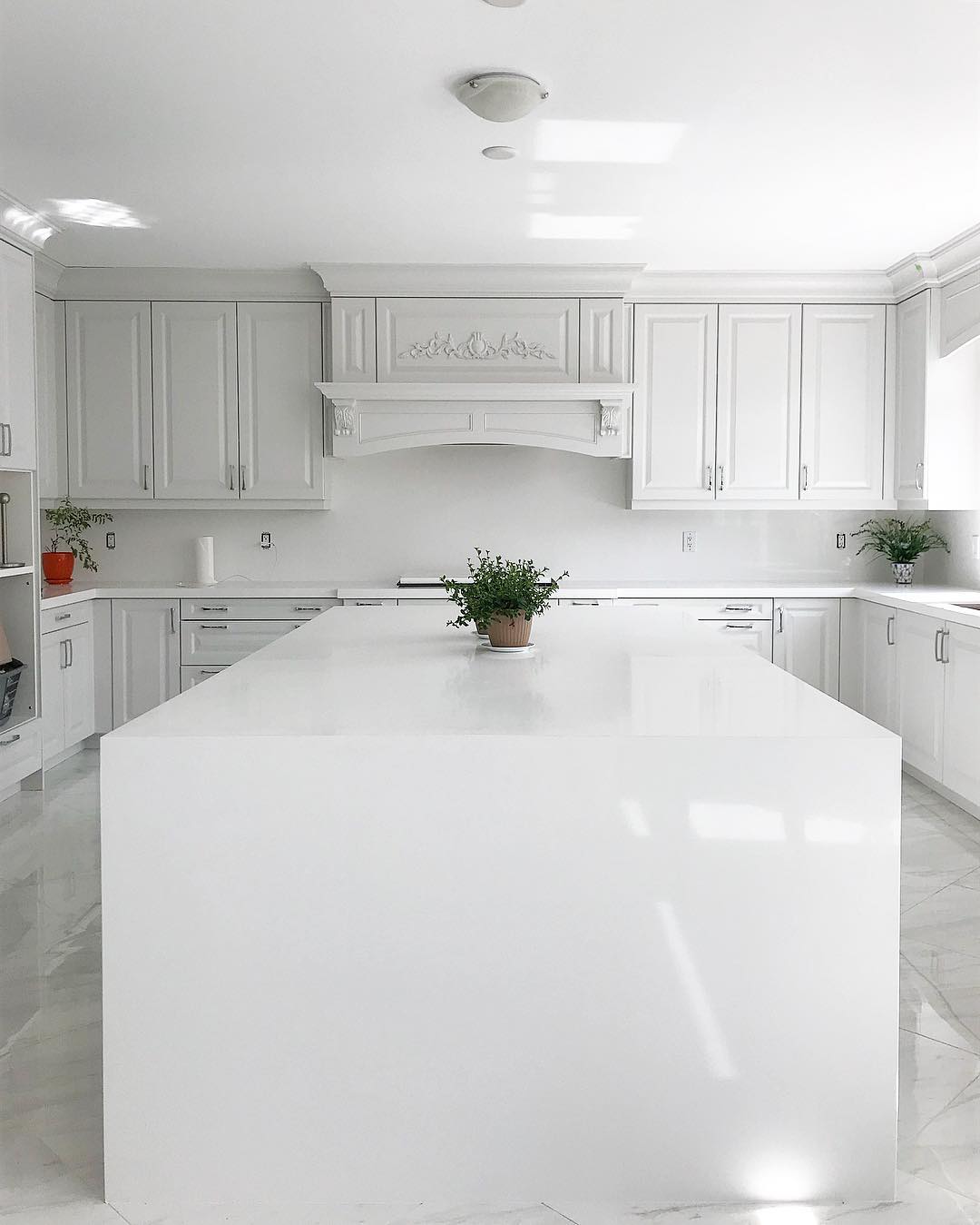 A massive quartz block anchors the room like a sculptural centerpiece—sleek, seamless, and spotless. Ornate crown molding and decorative vent hood details soften the starkness with a hint of classic formality. Glossy finishes on every surface bounce the light for a bright-white-on-bright-white effect. Minimalism goes maximal.