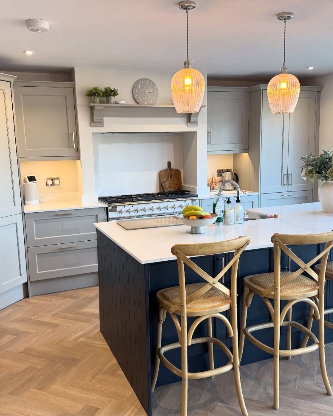 Creamy quartz counters top off this charming kitchen like the final layer of frosting. A navy island adds contrast and anchors the space, while woven stools and soft pendant lighting keep the mood warm and casual. Classic shaker cabinets in muted gray round out the palette. It’s cottage, but make it crisp.