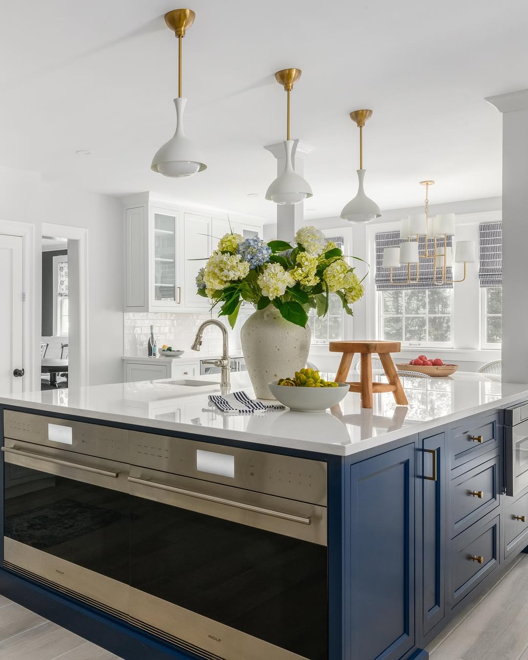 White quartz keeps its cool while the navy island brings the drama. It’s a striking combo—clean lines, crisp contrast, and just enough warmth from the brass accents. Built-in appliances disappear into the design instead of disrupting it. The vibe? Bold, but buttoned-up.