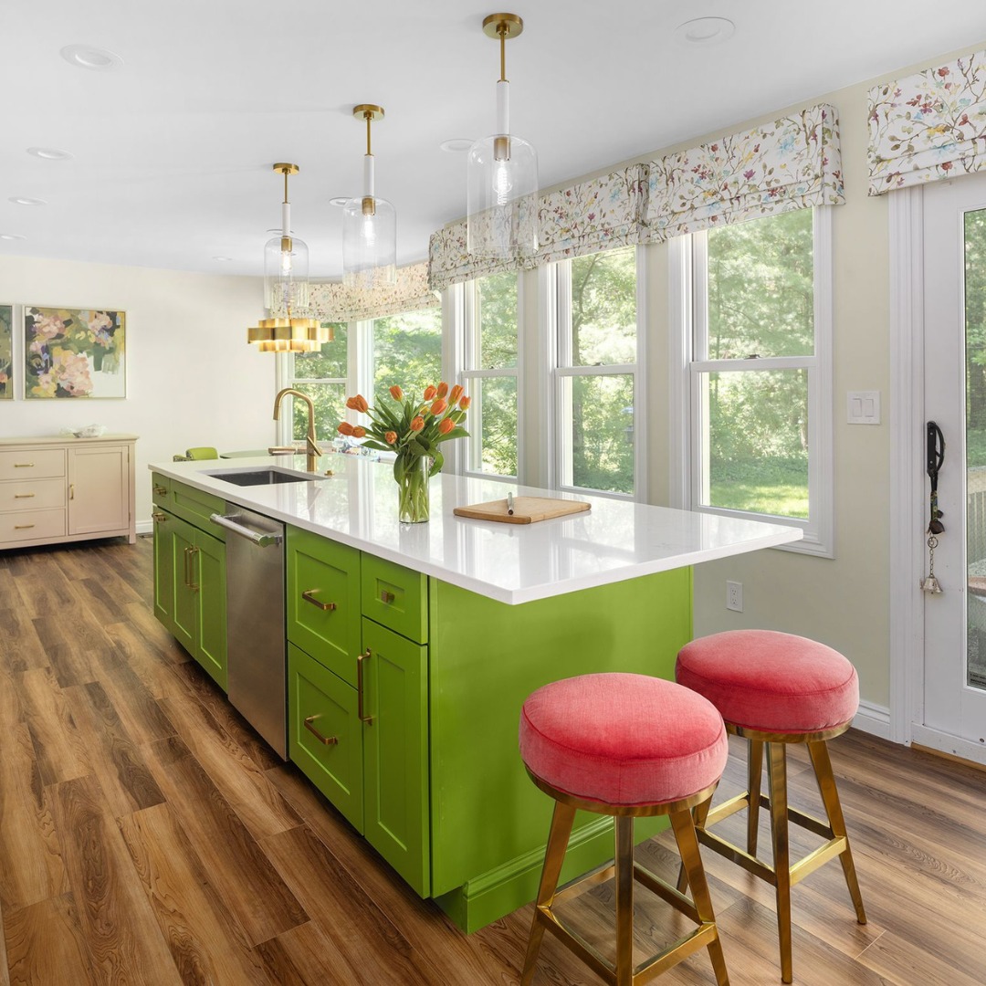 White quartz earns its place as the calm in this color-happy storm. The glossy surface keeps things feeling light and fresh against the punchy lime green island and cherry-hued stools. Sleek brass fixtures echo the glam, while the waterfall edge keeps it all looking crisp. Proof that bold can still be balanced.