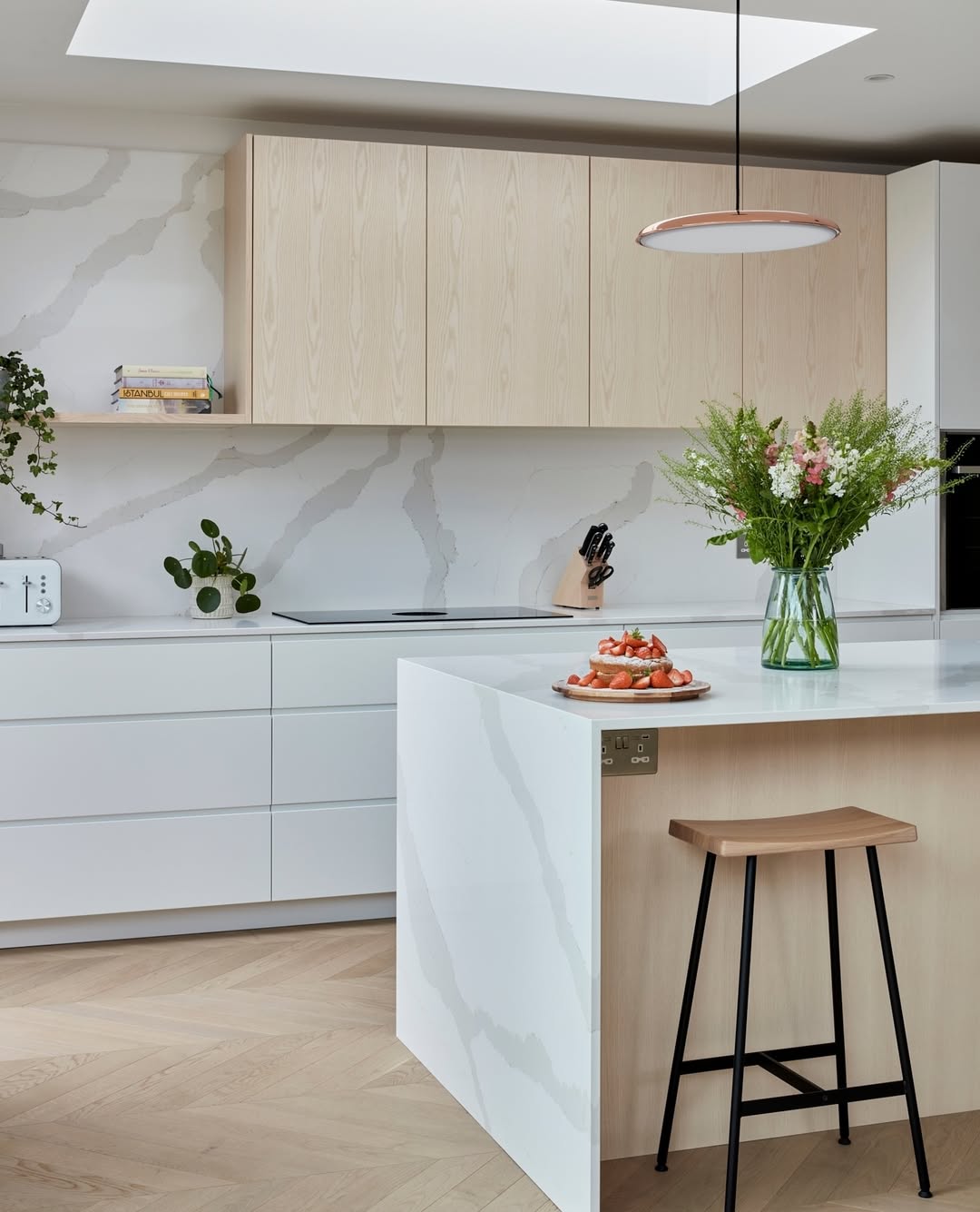 White quartz takes center stage here, not through flash, but through flow. Its soft veining carries from countertop to waterfall edge, echoing the gentle lines of the pale wood cabinetry. Seamless drawers and a handle-free design keep the look ultra-minimal. Natural light and herringbone floors finish the quietly luxe story.