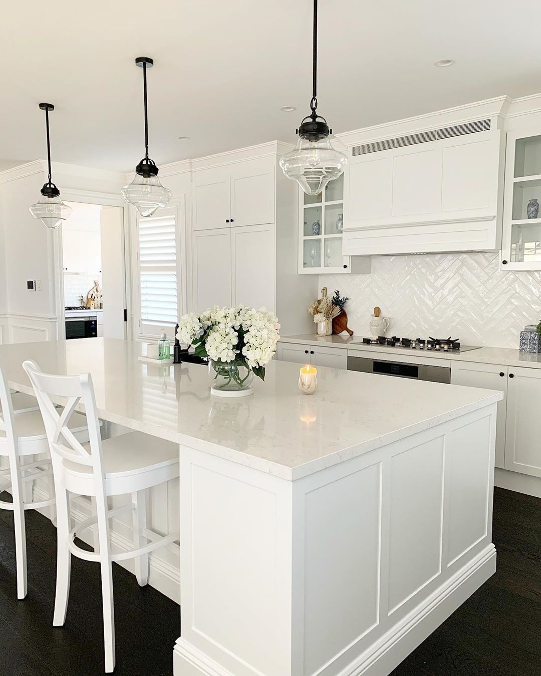 Soft veining and a satin finish give the quartz counters a tailored, almost traditional feel. Framed paneling on the island nods to classic millwork, while the herringbone backsplash adds just the right amount of texture. Glass pendants keep things airy up top. It’s monochrome—but far from monotone.