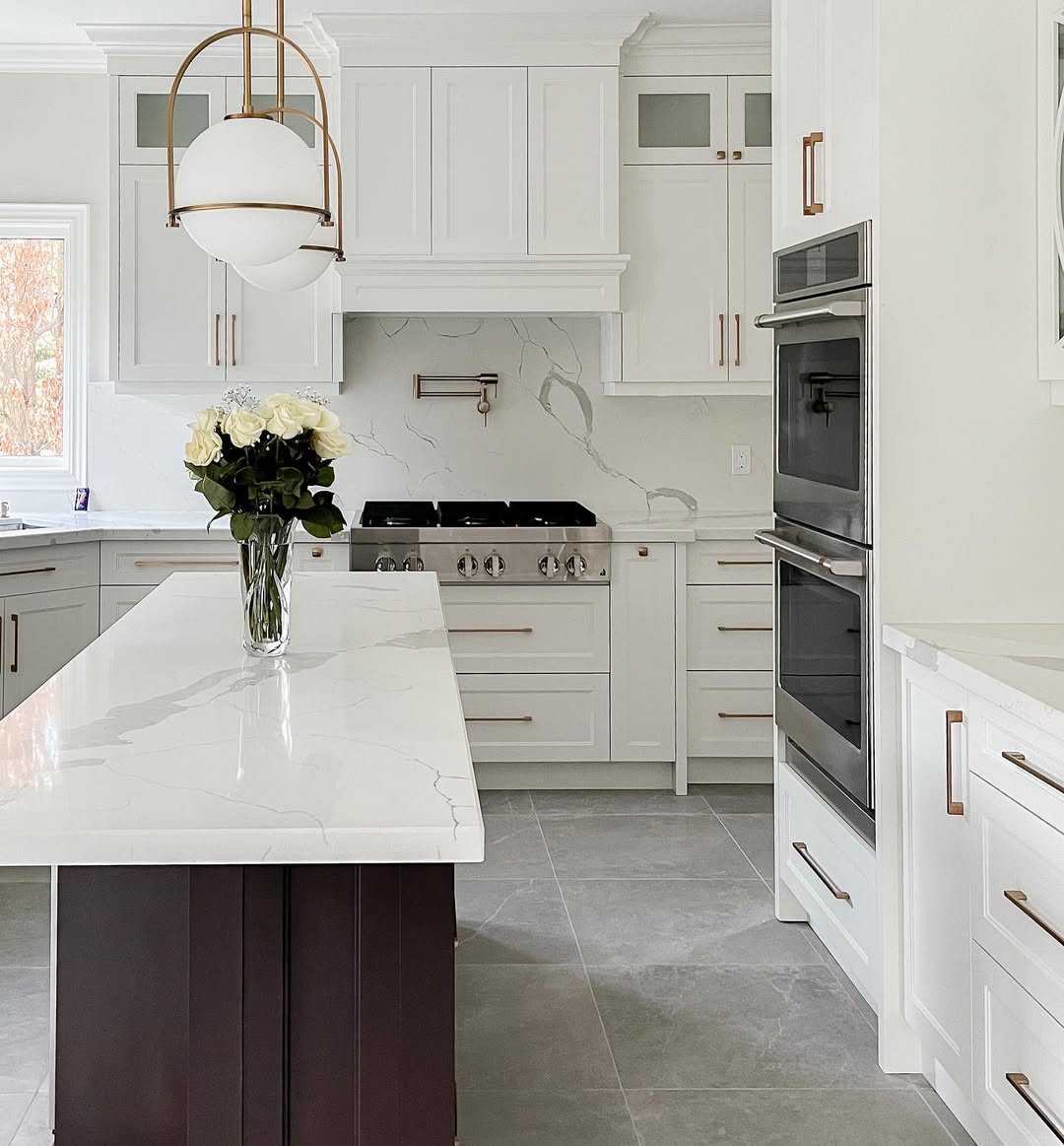 Sleek veining runs across the counters and backsplash in one continuous, sculptural stroke—like art you can prep dinner on. Brass hardware and that sculptural pendant light bring warmth without fuss. A deep espresso-toned island anchors the space, giving the bright surfaces room to breathe. Clean, crisp, and quietly luxurious.