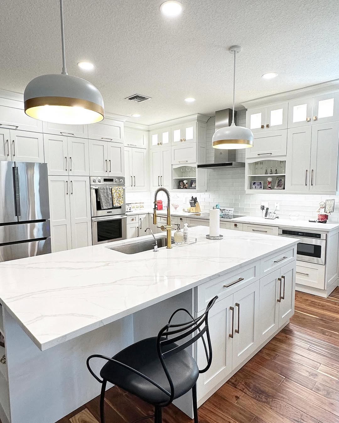 Soft, wide veining glides across the quartz surface, adding movement to the clean-lined layout. Brass fixtures echo the warm undertones in the wood floor, while matte pendants tie the whole look together. Built-in display nooks break up the cabinetry just enough. Sleek, functional, and full of subtle flair.
