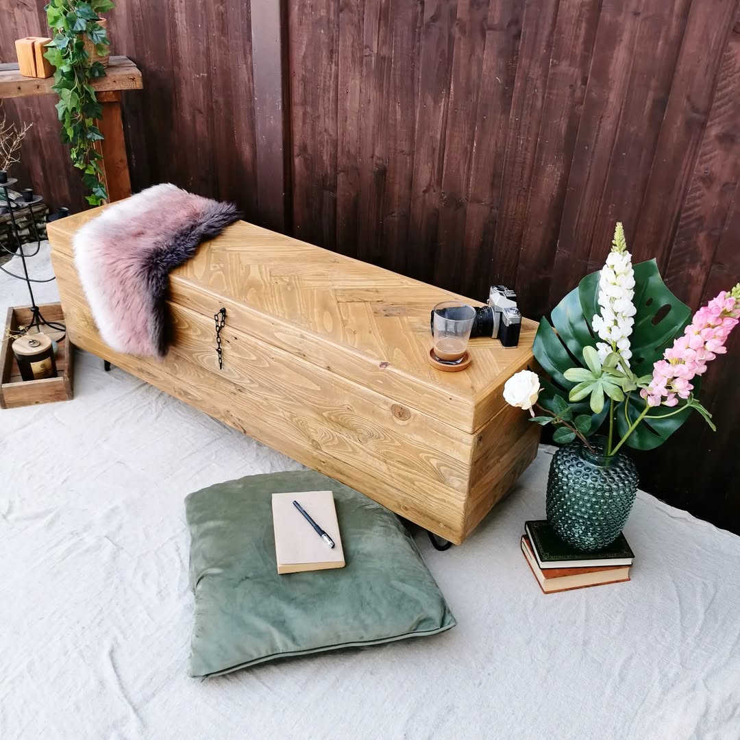 No need to choose between seating and storage when one piece does both beautifully. Natural wood grain and a herringbone-inspired lid add texture without trying too hard. The wheels make it easy to move, while the roomy interior hides everything from blankets to backyard gear. Style it as a coffee perch or patio staple—it’s game for both.