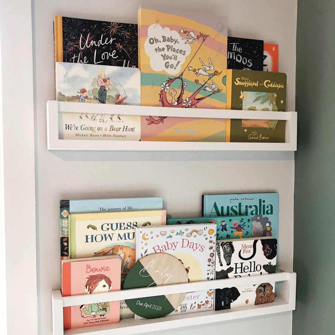 Forward-facing shelves turn book spines into storytime invitations. Clean-lined and wall-mounted, this setup keeps favorite reads visible and within reach—no clutter, just charm. Ideal for nurseries, playrooms, or reading nooks where space is tight but imagination is big. Even grown-ups might want a set.