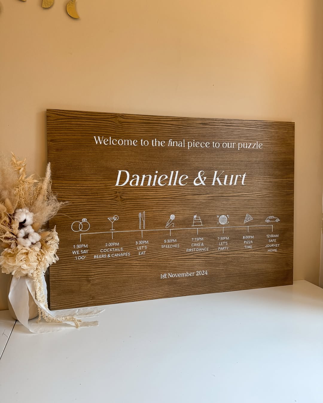 Every moment of the big day deserves a spotlight, and this custom plaque delivers just that. The clean white engraving pops against rich wood grain, turning your wedding timeline into a piece of modern art. Simple icons, elegant type, and a warm finish give it a polished-yet-personal feel. A keepsake that goes beyond the guestbook.